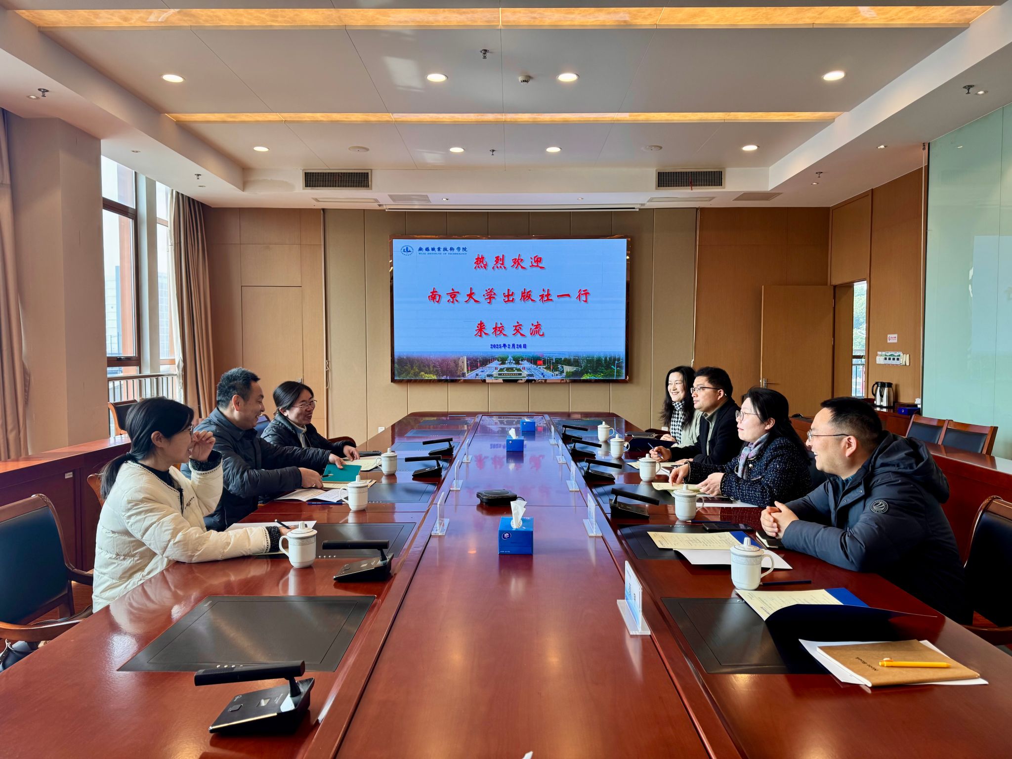 2月26日上午,南京大学出版社社长助理兼高校教材中心主任蔡文彬、副主任吴华、编辑钱梦菊等一行来校洽谈合作。副校长吴慧媛、无锡现代职业教育研究中心主任孙杰、教务处副处长吴兆明及相关人员参加交流。